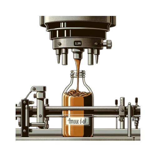 L’étape de remplissage des bouteilles Amour d’ail utilise une machine automatisée pour injecter précisément la sauce dans des bouteilles stérilisées, garantissant uniformité et qualité.